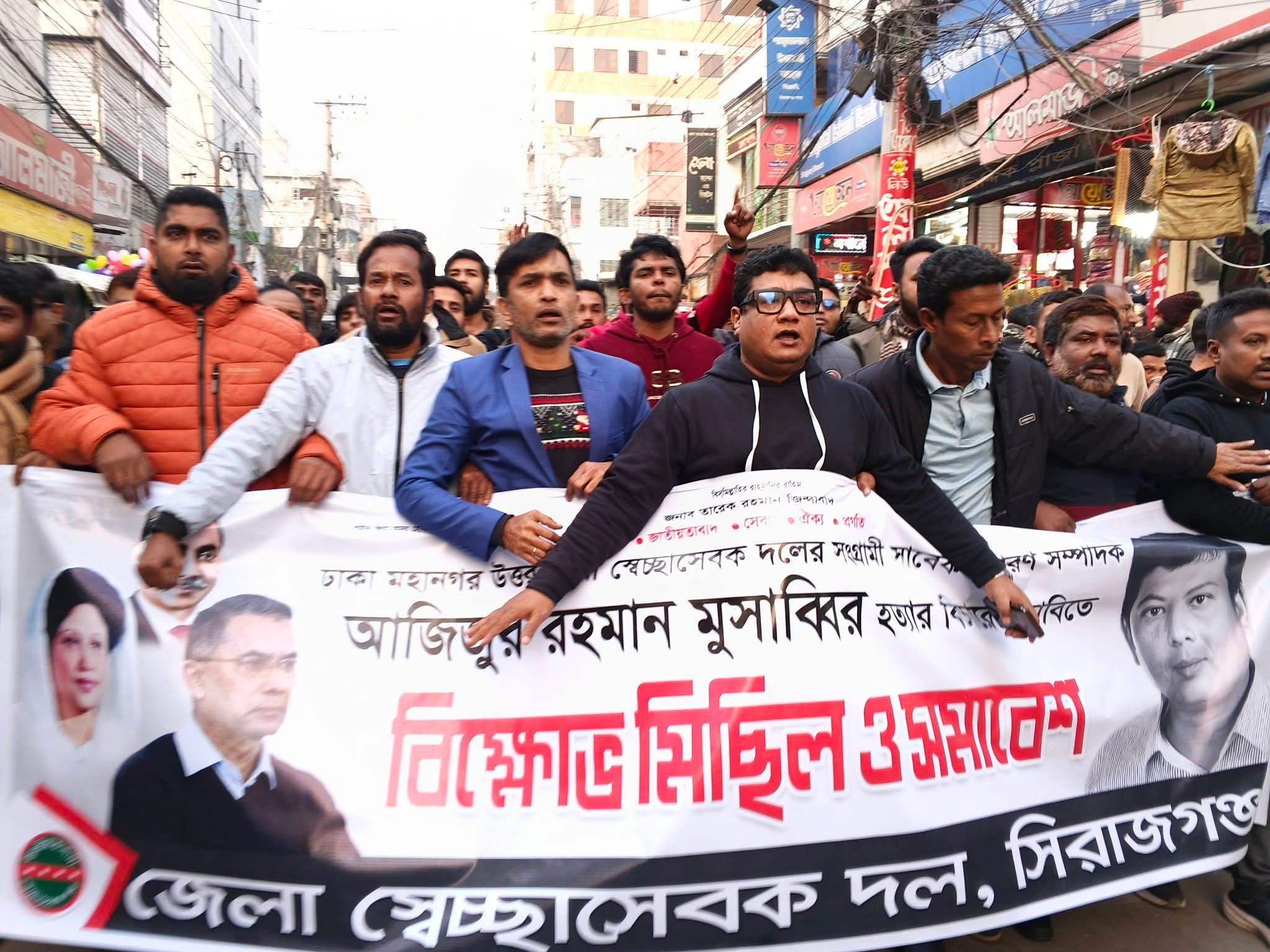 ঢাকা মহানগর উত্তর স্বেচ্ছাসেবক দলের সাবেক সাধারণ সম্পাদক আজিজুর রহমান মোসাব্বির কে নৃশংস ভাবে হত্যাকাণ্ডের প্রতিবাদে কেন্দ্রীয় স্বেচ্ছাসেবক দলের ঘোষিত কর্মসূচি'র অংশ হিসেবে সিরাজগঞ্জ জেলা শাখার স্বেচ্ছাসেবক দলের উদ্যোগে এক প্রতিবাদ সভা ও বিক্ষোভ মিছিল অনুষ্ঠিত হয়। জেলা জাতীয়তাবাদী স্বেচ্ছাসেবক দল সিরাজগঞ্জ জেলা শাখার উদ্যোগে- শনিবার (১০জানুয়ারি-২০২৬খ্রি.) বিকেলে সিরাজগঞ্জ জেলা বিএনপির কার্যালয়ের সন্মুখ এক প্রতিবাদ সভা ও সিরাজগঞ্জ শহরে প্রধান প্রধান সড়ক বিক্ষোভ মিছিল শেষে বাজার স্টেশন এক প্রতিবাদ সভা অনুষ্ঠিত হয়। উক্ত কর্মসূচি সিরাজগঞ্জ জেলা স্বেচ্ছাসেবক দলের আহ্বায়ক আব্দুল্লাহ আল কায়েস এঁর নেতৃত্বে এবং সদস্য সচিব মিলন হক রঞ্জু'র পরিচালনা প্রতিবাদ সভা ও বিক্ষোভ মিছিল অনুষ্ঠিত হয়। এতে সিরাজগঞ্জ জেলা স্বেচ্ছাসেবক দলের সিনিয়র যুগ্ন-আহবায়ক মোঃ আহসান হাবিব উজ্জ্বল, যুগ্ন-আহবায়ক মোঃ ছানোয়ার হোসেন ছানু, তানভীর শাকিল, আব্দুল কাদের তালুকদার রিমন, নাজমুল হক সহ অন্যান্য নেতৃবৃন্দ জেলা, উপজেলা /থানা ইউনিটের আওতাধীন বিভিন্ন ইউনিটের নেতাকর্মীরা স্বতঃস্ফূর্তভাবে অংশগ্রহণ করেন। উক্ত প্রতিবাদ সভা ও বিক্ষোভ মিছিলে বক্তারা প্রকাশ্যে সংঘটিত এই হত্যাকাণ্ডের তীব্র নিন্দা জানান এবং দোষীদের দ্রুত গ্রেপ্তার ও দৃষ্টান্তমূলক শাস্তির দাবি করেন। কর্মসূচিটি শান্তিপূর্ণভাবে সম্পন্ন হয়।
