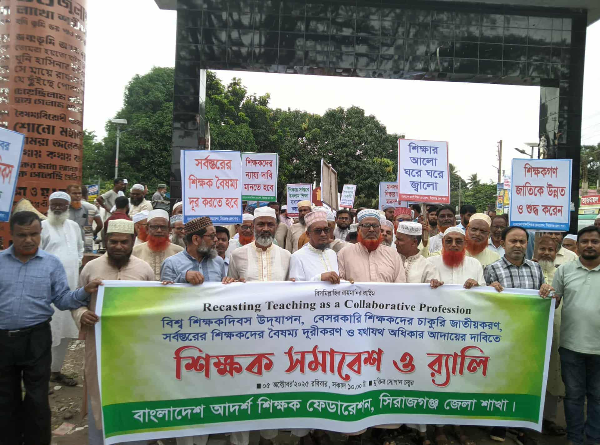 "শিক্ষকতা পেশা,মিলিত প্রচেষ্টার দীপ্তি" এ প্রতিপাদ্য নিয়ে-শিক্ষকদের প্রতি শ্রদ্ধা ও সম্মান জানাতে যথাযোগ্য মর্যাদা ও শ্রদ্ধার সাথে সারাবিশ্বের ন্যায় বাংলাদেশে ও পালিত হচ্ছে বিশ্ব শিক্ষক দিবস পালিত হয়। বেসরকারি শিক্ষকদের চাকুরী জাতীয়করণ সর্বস্তরের শিক্ষকদের বৈষম্য দূরীকরণ ও যথাযথ অধিকার আদায়ের দাবিতে সিরাজগঞ্জ বিশ্ব শিক্ষক দিবস পালন উপলক্ষে সমাবেশ অনুষ্ঠিত এবং বর্ণাঢ্য র্যালি প্রদর্শন করা হয়।আদর্শ শিক্ষক ফেডারেশন সিরাজগঞ্জ জেলা শাখার আয়োজনে,