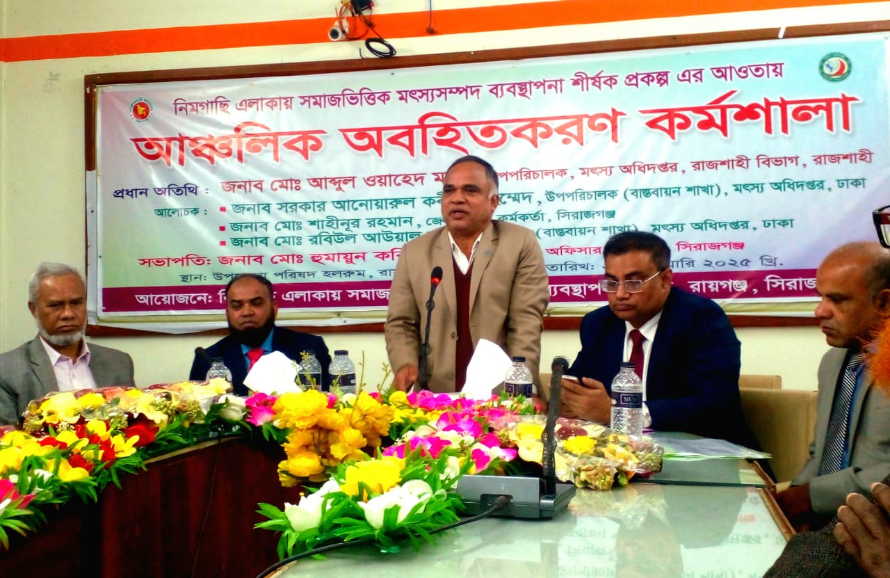 সিরাজগঞ্জের রায়গঞ্জে নিমগাছি সমাজভিত্তিক মৎস্য সম্পদ ব্যবস্থাপনা শীর্ষক প্রকল্পের আওতায় আঞ্চলিক অবহিতকরণ কর্মশালা অনুষ্ঠিত হয়েছে।