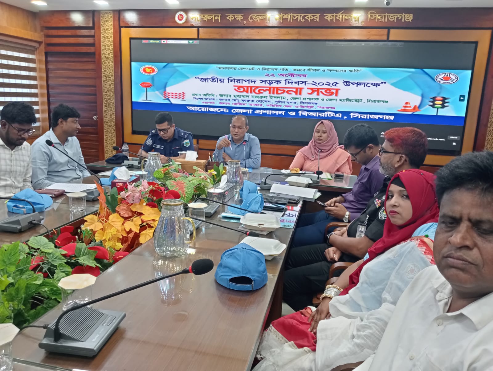 ‘'মানসম্পন্ন হেলমেট ও নিরাপদ গতি, কমবে জীবন ও সম্পদের ক্ষতি'’ এই প্রতিপাদ্য নিয়ে- সারা দেশের ন্যায় সিরাজগঞ্জে জাতীয় নিরাপদ সড়ক দিবস-২০২৫ খ্রিঃপালিত হয়েছে। বুধবার (২২ অক্টোবর) সকাল ১১টার দিকে সিরাজগঞ্জ জেলা প্রশাসক কার্যালয়ের সম্মুখে বেলুনফেস্টুন উড়িয়ে অনুষ্ঠানের উদ্বোধন করা হয় পরে বর্ণাঢ্য র্যালিটি সড়ক প্রদক্ষিন করে এসে জেলা প্রশাসক কার্যালয়ের শহিদ এ,কে, শামসুদ্দিন সম্মেলন কক্ষে- সচেতনতামূলক ভিডিও চিত্র প্রদর্শন, হেলমেট বিতরণ ও আলোচনা সভা অনুষ্ঠিত হয়। এ অনুষ্ঠানের প্রধান অতিথি হিসেবে উপস্থিত ছিলেন এবং বক্তব্যে রাখেন, সুযোগ্য জেলা প্রশাসক মুহাম্মদ নজরুল ইসলাম। অনুষ্ঠানের সভাপতিত্ব করেন, অতিরিক্ত জেলা প্রশাসক (রাজস্ব) মোছাঃ নুর নাহার বেগম। বিশেষ অতিথি হিসেবে উপস্থিত ছিলেন, অতিরিক্ত পুলিশ সুপার মোঃ হাফিজুর রহমান, র্যাব-১২ এর ডিএডি মোঃ নজরুল ইসলাম খান প্রমুখ। অনুষ্ঠানটি পরিচালনা করেন, বিআরটিএ,সিরাজগঞ্জ সার্কেল সিরাজগঞ্জ মোটরযান পরিদর্শক মোঃ হাফিজুল ইসলাম। এসময়ে অনুষ্ঠানে সিরাজগঞ্জ সরকারি কলেজের ইংরেজি বিভাগের প্রভাষক মোঃ মোফাজ্জল হোসাইন, সিরাজগঞ্জ জজকোর্ট আইনজীবি অ্যাডভোকেট রোজিনা খাতুন রুহানা, ছাত্রপ্রতিনিধি সজীব সরকার, সড়ক বিভাগ সিরাজগঞ্জের উপ-পরিচালক প্রকৌশলী কাজল ইসলাম, বিআরটিসি প্রশিক্ষণ কেন্দ্রের ম্যানেজার হাসিবুর রহমান, নিরাপদ সড়ক চাই সিরাজগঞ্জের আহবায়ক মোঃ সাইফুল ইসলাম, নারীনেত্রী মনিজা খাতুন, সিরাজগঞ্জ জেলা ট্রাক এবং ট্যাংকলরী কাভার্ডভ্যান পরিবহন শ্রমিক ইউনিয়নের আহবায়ক মোঃ শামসুল আলম, সিরাজগঞ্জ ট্রাক ও ট্যাংকলরী মালিক গ্রুপের সড়ক ও প্রচার সম্পাদক মোঃ শফিকুল ইসলাম টিটো, সিরাজগঞ্জ সিএনজি শ্রমিক ইউনিয়নের ভারপ্রাপ্ত সভাপতি ইসমাইল হোসেন, সাধারণ সম্পাদক মোঃ জাহিদুল ইসলাম লিটন, মেসার্স পার্ক ফিলিং স্টেশন সিরাজগঞ্জের আব্দুর রউফ, মেসার্স ভূইয়া ফিলিং স্টেশনের ইশতিয়াক, মিরপুর ফিলিং স্টেশন সিরাজগঞ্জের আকবর আলী সহ রোভার স্কাউটস সদস্যরা উপস্থিত ছিলেন।