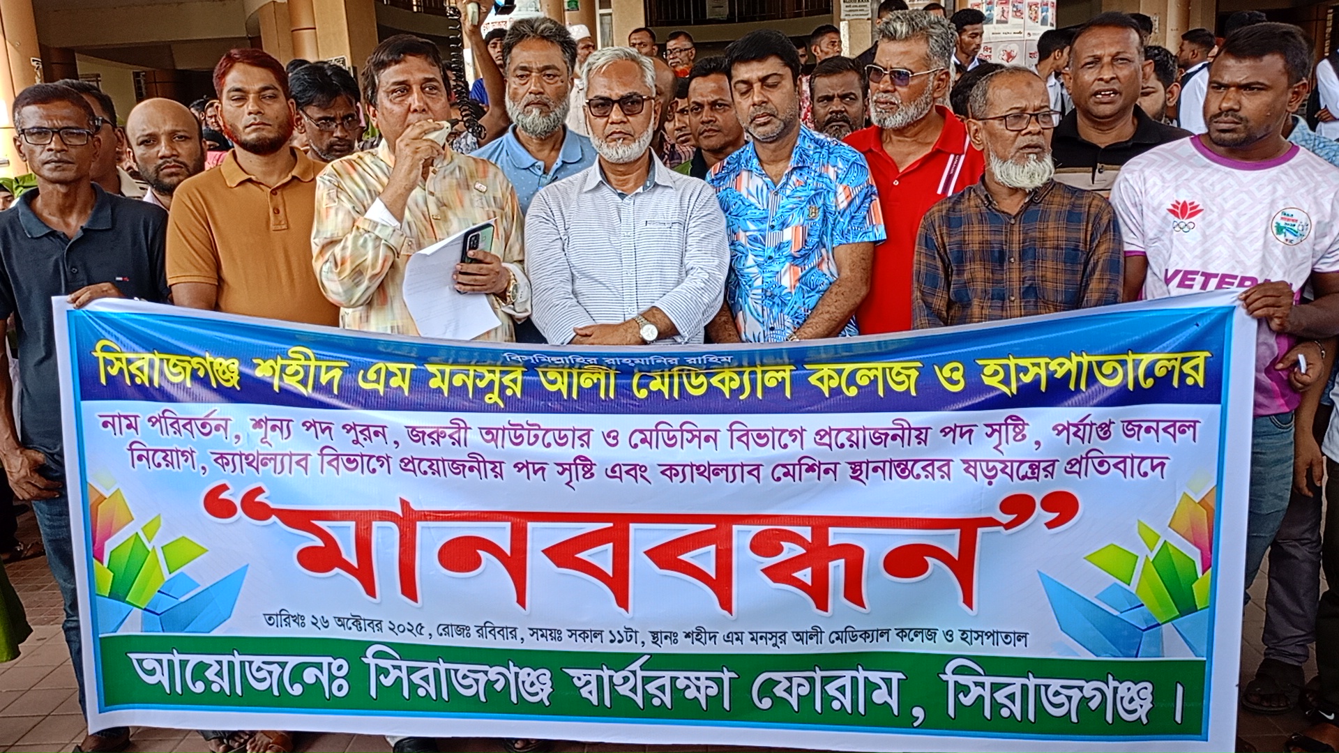 সিরাজগঞ্জে মেডিকেল থেকে ক্যাথ-ল্যাব মেশিন সরানোর প্রতিবাদ ও ৫ দফা দাবীতে মানববন্ধন